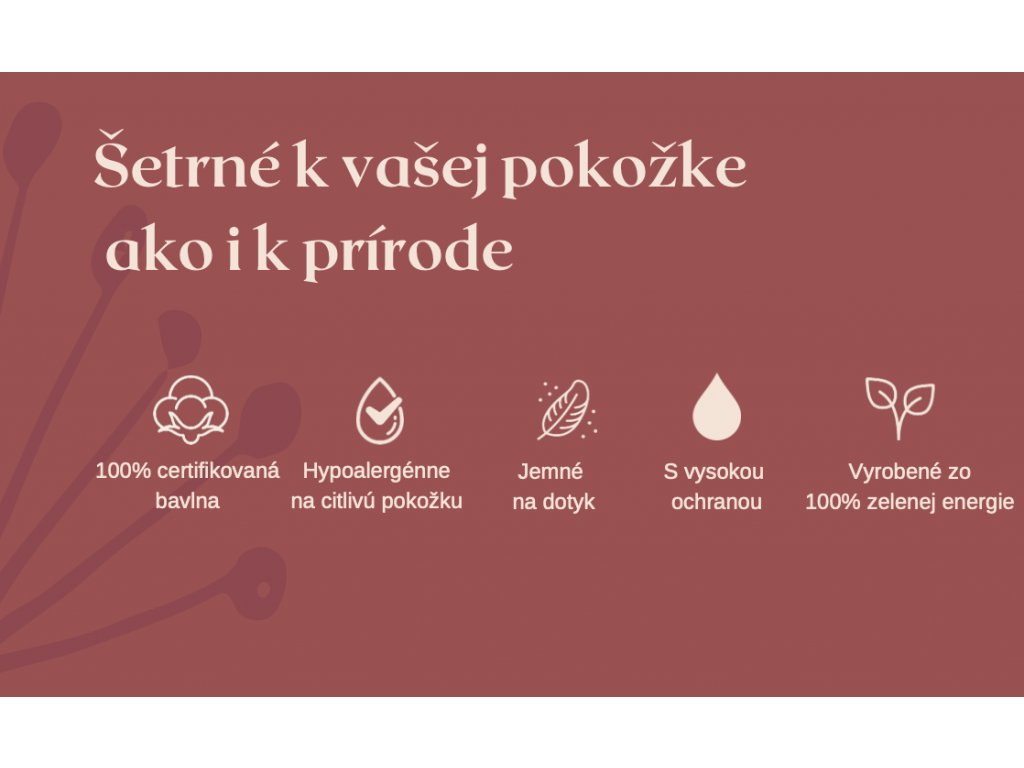 Jemná 100 % BIO bavlna, ktorá sa nachádza v našich menštruačných produktoch je ideálna pre vašu intímnu oblasť, keďže ponúka ochranu plne prírodného materiálu. Organická bavlna vyrástla prirodzene, bez použitia akýchkoľvek chemikálií.